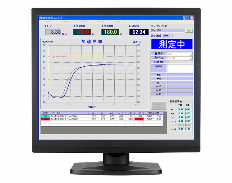 加硫試験機 このローターレスタイプ加硫試験機は、先進の密閉形円すいダイ方式を採用し、対応主要規格である JIS K 6296-3、ISO 6502、ASTM D5289等に準拠して作られ、使い易さ・低価格を実現した高性能加硫試験機です。 優れた密閉型円すいダイの採用 世界中で多く使われている密閉型円すいダイは、特に加硫初期の感受性に優れ、ダイパターンを放射状に並べることにより、サンプルゴムのスリップを防止しています。そして、優れた温度分布と温度コントロール性能を実現しました。特にデータの精度と再現性に優れています。 操作性を重視した設計 試験条件を選択し、測定者・バッチNo.を指定後、あとはスタートボタンを押すだけで自動スタートする設計になっております。同じ条件で測定する場合は、2回目からはスタートボタンを押すだけで連続測定が可能です。 測定中は、加硫曲線・上下ダイ温度を画面上にリアルタイムに表示します。さらに同じ試験条件での連続測定であれば、加硫曲線を重ねて表示しますので、目視で簡単に比較することができます。 試験結果レポートの作成 標準レポート 試験条件の詳細情報が表示され、統計値(平均値、σ、CV値)が自動算出されます。 比較レポート 過去のデータと現在のデータを比較することが可能です。 仕様 ダイ形状 密閉型円すいダイ方式 振幅角 ±1.0°(Option:0.5,2.0,etc)選択可 最大トルク 20 N・m 温度制御範囲 50℃~200℃(Option:230℃) 加熱方式 フィルムヒーターによる上下ダイ独立加熱 加圧方式 無給油エアシリンダ 常用空気圧 0.50MPa ダイの密閉力 11kN 電源 AC100V 6A 50/60Hz or AC220V 3A 50/60Hz PC基本仕様 Windows,icrosoft Excel 寸法/重量 510x510x1030(mm)/130kg