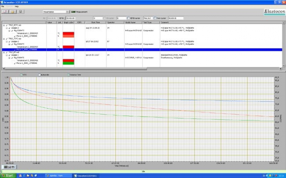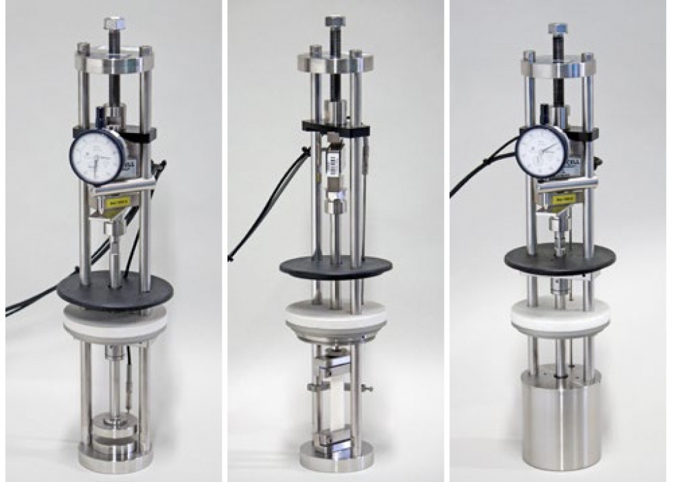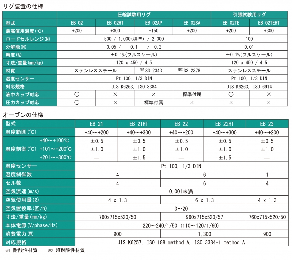 応力緩和試験機 各専用リグ装置を用いて、圧縮応力緩和と引張応力緩和の両試験を連続的に行なうことのできる試験機です。本機は、スウェーデンのエラストコン社が長年の研究の末開発した画期的な試験機で、現在のISO規格の基にもなり、欧州で広く使用されています。また、液体中の圧縮応力緩和試験用リグも用意され、設定試験温度下で直接応力緩和を連続的に測定できます。 リグ Rig リグ装置は、圧縮試験用・引張試験用の2種類あります。液中試験用のカップを装着することにより、液中圧縮試験・液中引張試験を行なうことができます。 オーブン Oven 各槽完全に独立したセル型オーブンで、複数のリグを長時間一定の温度で安定的に保つように設計されています。また、熱老化試験用オーブンとして使用することもできます。EB 21 – 4セル独立温度制御EB 22 – 6セル独立温度制御 EB 23 – 4セル同一温度制御 ソフトウェア Software 引張・圧縮応力緩和試験の測定データを、リアルタイムにグラフに表示し、緩和指数F/Foは自動的に計算されます。測定データは、エクスポート機能を使い、テキストファイルに保存することができます。 圧縮リグ装置の仕様 型式 EB 02 最高使用温度 +200℃ ロードセルレンジ(N) 500/1,000(標準)/2,000 分解能(N) 0.05/0.1/0.2 精度 ±0.1%(フルスケール) 寸法/重量 120x450(mm)/4.5kg 材質 ステンレススチール 温度センサー Pt 100, 1/3 DIN 対応規格 JIS K6263, ISO 3384 液中カップ対応 〇 圧力カップ対応 〇 型式 EB 02HT 最高使用温度 +300℃ ロードセルレンジ(N) 500/1,000(標準)/2,000 分解能(N) 0.05/0.1/0.2 精度 ±0.1%(フルスケール) 寸法/重量 120x450(mm)/4.5kg 材質 ステンレススチール 温度センサー Pt 100, 1/3 DIN 対応規格 JIS K6263, ISO 3384 液中カップ対応 × 圧力カップ対応 × 型式 EB 02AP 最高使用温度 +150℃ ロードセルレンジ(N) 500/1,000(標準)/2,000 分解能(N) 0.05/0.1/0.2 精度 ±0.1%(フルスケール) 寸法/重量 120x450(mm)/4.5kg 材質 SS 2343(耐酸性材質) 温度センサー Pt 100, 1/3 DIN 対応規格 JIS K6263, ISO 3384 液中カップ対応 × 圧力カップ対応 標準付属 型式 EB 02SA 最高使用温度 +200℃ ロードセルレンジ(N) 500/1,000(標準)/2,000 分解能(N) 0.05/0.1/0.2 精度 ±0.1%(フルスケール) 寸法/重量 120x450(mm)/4.5kg 材質 SS 2378(超耐酸性材質) 温度センサー Pt 100, 1/3 DIN 対応規格 JIS K6263, ISO 3384 液中カップ対応 標準付属 圧力カップ対応 × 引張試験用リグの仕様 型式 EB 02TE 最高使用温度 +200℃ ロードセルレンジ(N) 100 分解能(N) 0.01 精度 ±0.1%(フルスケール) 寸法/重量 120x450(mm)/4.5kg 材質 ステンレススチール 温度センサー Pt 100, 1/3 DIN 対応規格 JIS K6263, ISO 6914 液中カップ対応 〇 圧力カップ対応 × 型式 EB 02TEHT 最高使用温度 +300℃ ロードセルレンジ(N) 100 分解能(N) 0.01 精度 ±0.1%(フルスケール) 寸法/重量 120x450(mm)/4.5kg 材質 ステンレススチール 温度センサー Pt 100, 1/3 DIN 対応規格 JIS K6263, ISO 6914 液中カップ対応 × 圧力カップ対応 × オーブンの仕様 型式 EB 21 温度範囲 +40 ~ +200 ℃ 温度制御 +40 ~ +100℃ +101~ +200℃ +201~ +300℃ ± 0.5 ℃± 1.0 ℃ ー 温度センサー Pt 100, 1/3 DIN 温度制御数 4 セル数 4 空気流速 0.001m/s 未満 空気使用量 4 × 1.3 ℓ 空気置換率 3~20 回/h 寸法・重量 760×715×520 mm /50kg 本体電源 220~240 V phase 1 50 Hz 又は 110~120 V phase 1 60 Hz 消費電力 900 W 対応規格 JIS K6257, ISO 188 method A, ISO 3384-1 method A 型式 EB 21HT 温度範囲 +40 ~ +300 ℃ 温度制御 +40 ~ +100℃ +101~ +200℃ +201~ +300℃ ± 0.5 ℃± 1.0 ℃± 1.5 ℃ 温度センサー Pt 100, 1/3 DIN 温度制御数 4 セル数 4 空気流速 0.001m/s 未満 空気使用量 4 × 1.3 ℓ 空気置換率 3~20 回/h 寸法・重量 760×715×520 mm /50kg 本体電源 220~240 V phase 1 50 Hz 又は 110~120 V phase 1 60 Hz 消費電力 900 W 対応規格 JIS K6257, ISO 188 method A, ISO 3384-1 method A 型式 EB 22 温度範囲 +40 ~ +200 ℃ 温度制御 +40 ~ +100℃ +101~ +200℃ +201~ +300℃ ± 0.5 ℃± 1.0 ℃ ー 温度センサー Pt 100, 1/3 DIN 温度制御数 6 セル数 6 空気流速 0.001m/s 未満 空気使用量 6 × 1.3 ℓ 空気置換率 3~20 回/h 寸法・重量 960×715×520 mm /57kg 本体電源 220~240 V phase 1 50 Hz 又は 110~120 V phase 1 60 Hz 消費電力 1,300 W 対応規格 JIS K6257, ISO 188 method A, ISO 3384-1 method A 型式 EB 22HT 温度範囲 +40 ~ +300 ℃ 温度制御 +40 ~ +100℃ +101~ +200℃ +201~ +300℃ ± 0.5 ℃± 1.0 ℃± 1.5 ℃ 温度センサー Pt 100, 1/3 DIN 温度制御数 6 セル数 6 空気流速 0.001m/s 未満 空気使用量 6 × 1.3 ℓ 空気置換率 3~20 回/h 寸法・重量 960×715×520 mm /57kg 本体電源 220~240 V phase 1 50 Hz 又は 110~120 V phase 1 60 Hz 消費電力 1,300 W 対応規格 JIS K6257, ISO 188 method A, ISO 3384-1 method A 型式 EB 23 温度範囲 +40 ~ +200 ℃ 温度制御 +40 ~ +100℃ +101~ +200℃ +201~ +300℃ ± 0.5 ℃± 1.0 ℃ ー 温度センサー Pt 100, 1/3 DIN 温度制御数 1 セル数 4 空気流速 0.001m/s 未満 空気使用量 4 × 1.3 ℓ 空気置換率 3~20 回/h 寸法・重量 760×715×520 mm /50kg 本体電源 220~240 V phase 1 50 Hz 又は 110~120 V phase 1 60 Hz 消費電力 900 W 対応規格 JIS K6257, ISO 188 method A, ISO 3384-1 method A 仕様比較表