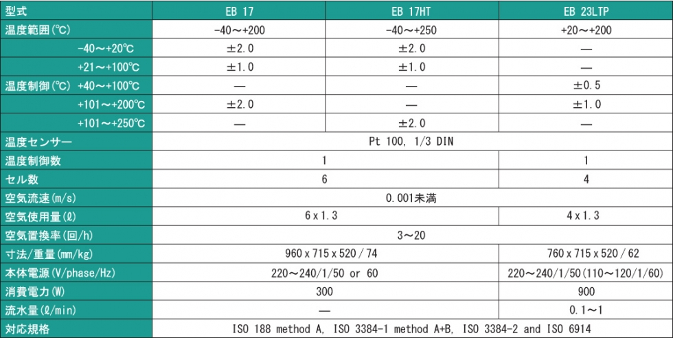温度サイクル試験機 高温と低温の温度サイクル試験用のオーブンです。高温における応力緩和と、低温における材料の収縮による応力緩和を測る必要性がISO TC45 委員会で議論されています。温度サイクル試験は、シールの収縮によるリークの要因など重要な情報を得ることができます。特に自動車産業にとって、シールの収縮による漏れが大きな問題になっており、温度サイクル試験はそれに関する重要な情報を与えてくれます。 各試験機の仕様 型式 EB 17 温度範囲 -40 ~ +200 ℃ 温度制御 -40 ~ +20℃ +21 ~ +100℃ +101~ +200℃ ± 2.0 ℃± 1.0 ℃± 2.0 ℃ 温度センサー Pt 100, 1/3 DIN 温度制御数 1 セル数 6 空気流速 0.001m/s 未満 空気使用量 6 × 1.3 ℓ 空気置換率 3 ~ 20 回/h 寸法・重量 960×715×520 mm /74kg 本体電源 220~240V/1phase/50Hz or 60Hz 消費電力 300 W 流水量 ー 対応規格 ISO 188 method A, ISO 3384-1 method A+B, ISO 3384-2 and ISO 6914 型式 EB 17 HT 温度範囲 -40 ~ +250 ℃ 温度制御 -40 ~ +20℃ +21 ~ +100℃ +101~ +250℃ ± 2.0 ℃± 1.0 ℃± 2.0 ℃ 温度センサー Pt 100, 1/3 DIN 温度制御数 1 セル数 6 空気流速 0.001m/s 未満 空気使用量 6 × 1.3 ℓ 空気置換率 3 ~ 20 回/h 寸法・重量 960×715×520 mm /74kg 本体電源 220~240V/1phase/50Hz or 60Hz 消費電力 300 W 流水量 ー 対応規格 ISO 188 method A, ISO 3384-1 method A+B, ISO 3384-2 and ISO 6914 型式 EB 23 LTP 温度範囲 +20 ~ +200 ℃ 温度制御 +20 ~ +100℃ +101 ~ +200℃ ± 2.0 ℃± 1.0 ℃ 温度センサー Pt 100, 1/3 DIN 温度制御数 1 セル数 4 空気流速 0.001m/s 未満 空気使用量 4 × 1.3 ℓ 空気置換率 3 ~ 20 回/h 寸法・重量 760×715×520 mm /62kg 本体電源 220~240V/1phase/50Hz or 110~120V/1phase/60Hz 消費電力 900 W 流水量 0/1 ~ 1 ℓ / min 対応規格 ISO 188 method A, ISO 3384-1 method A+B, ISO 3384-2 and ISO 6914 仕様比較表