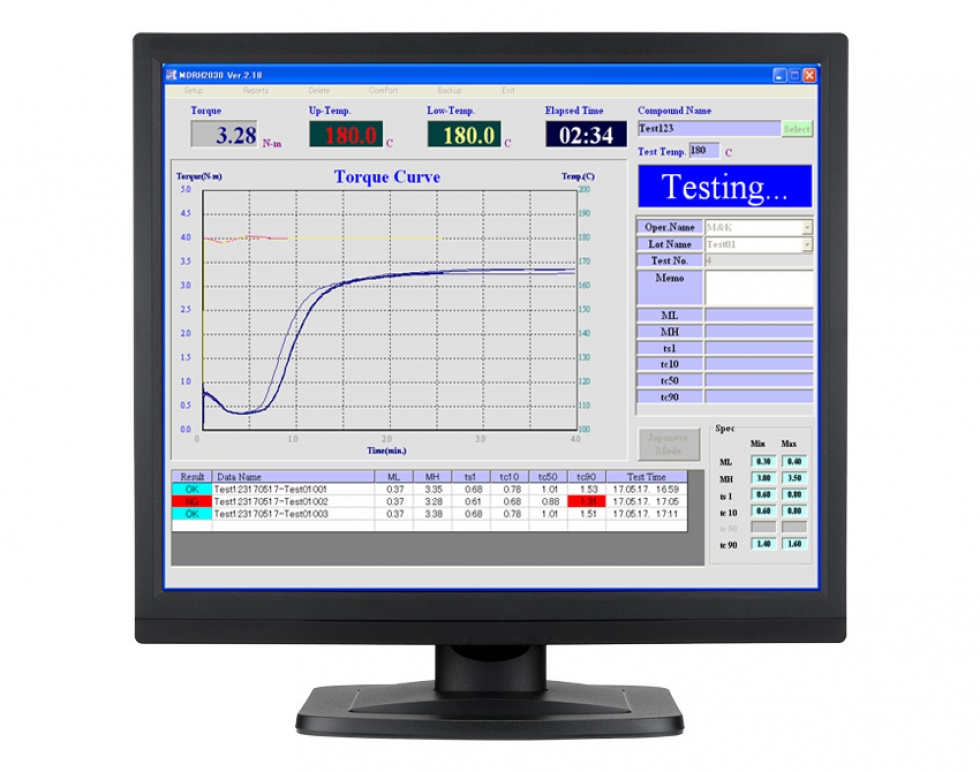 The cure curve and the upper and the lower die temperature are displayed on the graph and these data are plotted in real time. To compare the results easily, the cure curves are overlaid on the graph.